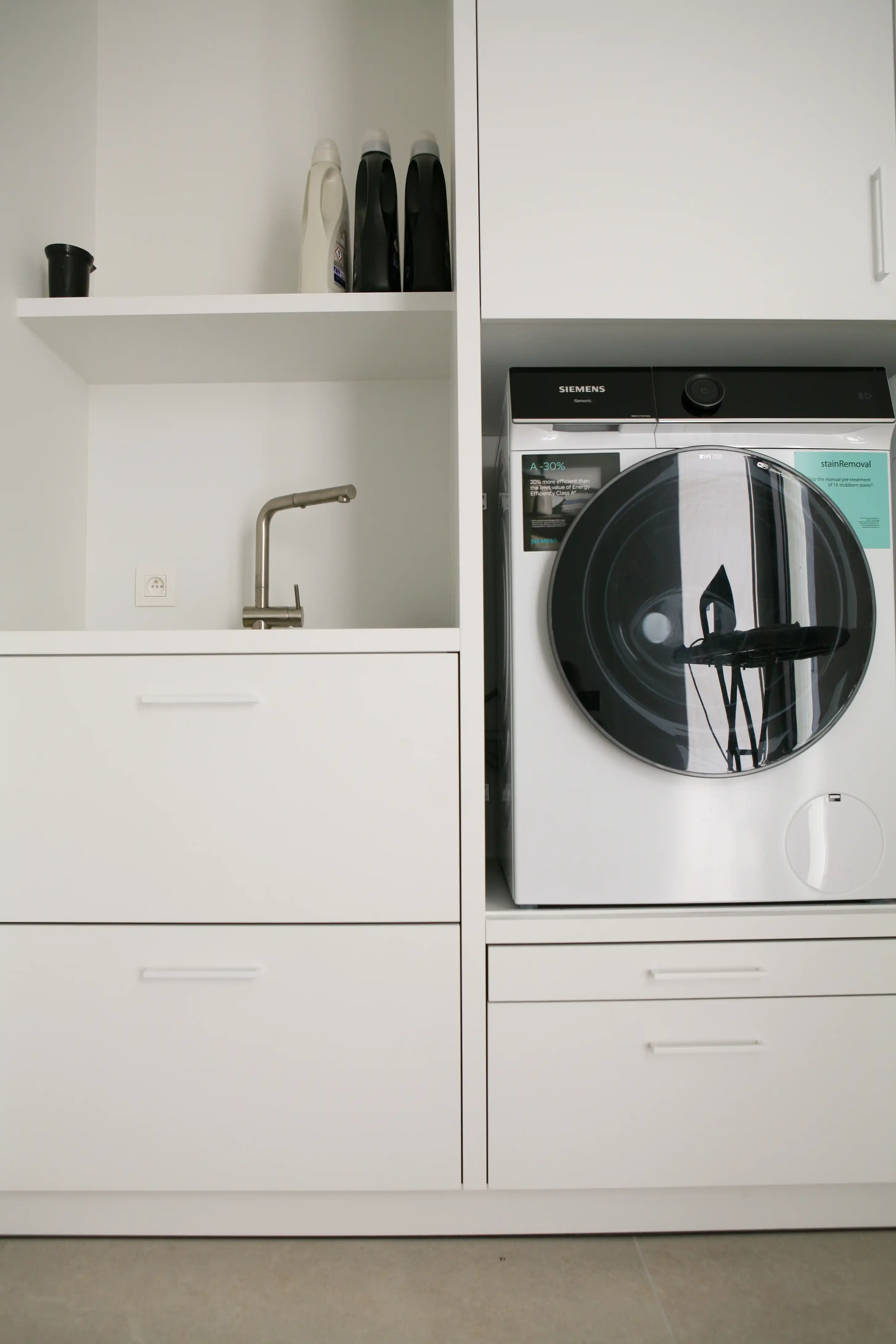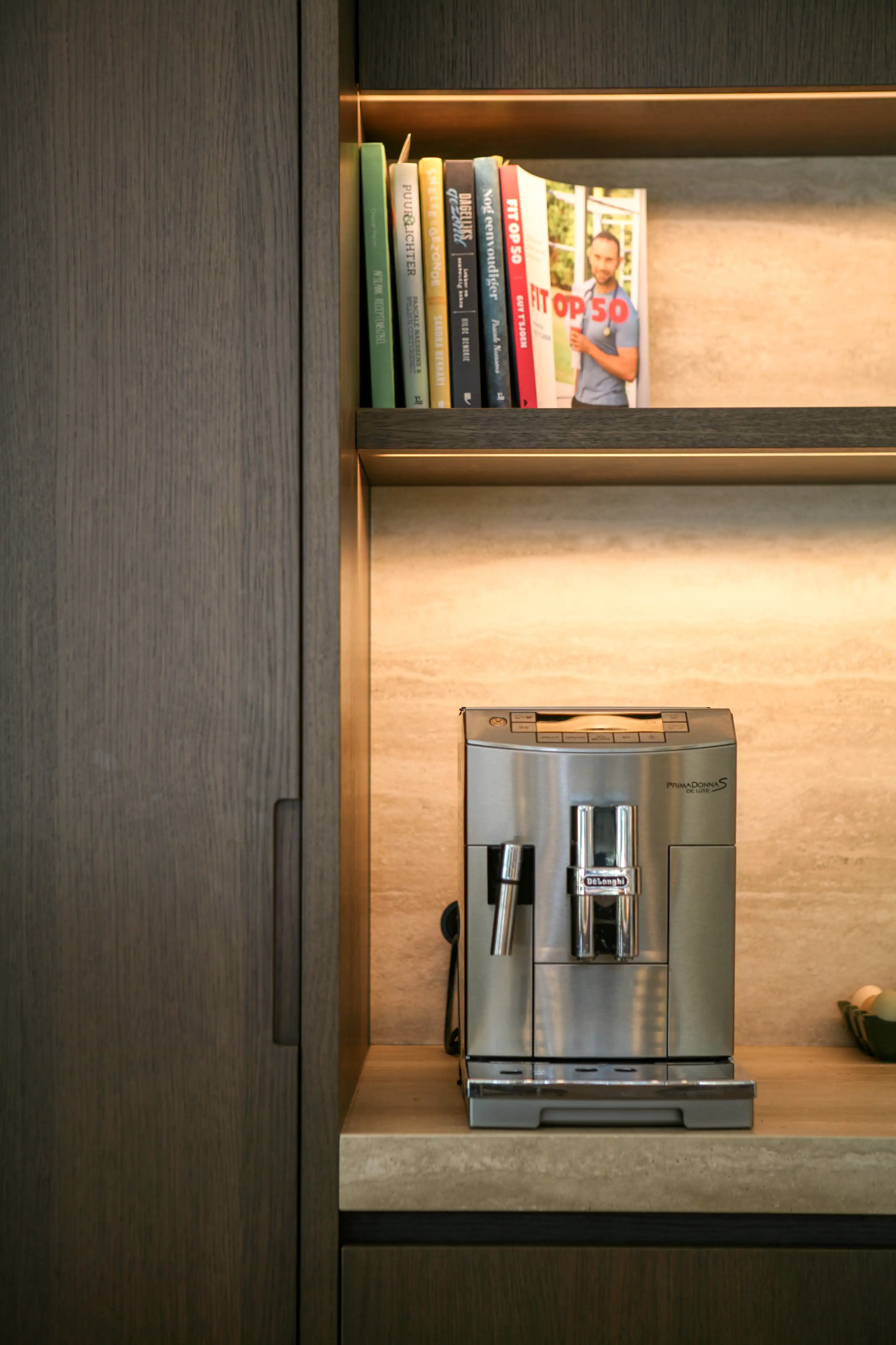Ook de keuken werd geïntegreerd in het totaalconcept, in samenwerking met onze partner De Schutter, zodat esthetiek en afwerking naadloos aansluiten.